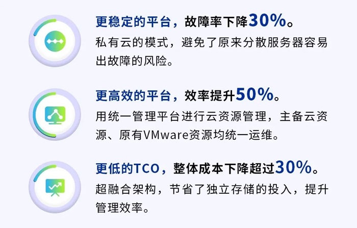 通过“VMware+深信服HCI”双栈架构主备容灾私有云的建设,陕西地电获得的资源丰富度、稳定性都有很大的提升,包括传统的计算、存储的IaaS类资源,容器、分布式数据库等PaaS类资源等,在发挥IT支撑业务的同时,也可以让IT引领未来的业务需求。