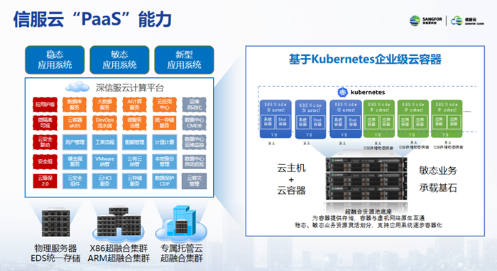 不仅包含IaaS能力,信服云还具备完整的PaaS能力。目前,信服云PaaS平台完成了对x86超融合集群和ARM超融合集群的适配,能为用户提供完整的解决方案。此外,信服云PaaS平台还具备容器云、DevOps、微服务治理、大数据以及RDS等能力。