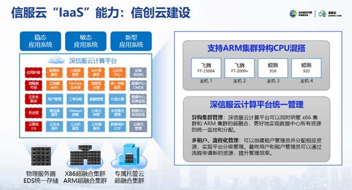 在IaaS层面,信服云不仅拥有基于通用x86架构的超融合产品,还推出了自主创新x86架构和ARM架构的超融合产品,能够对异构超融合集群进行管理。通过双栈技术能力,可实现数据实时互为备份,交替运行,保障业务安全稳定。