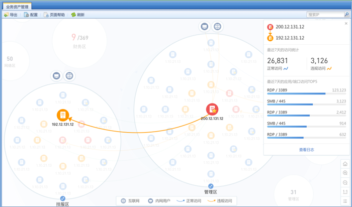 管理员以下一代防火墙自动对数据中心的业务资产及互访关系进行识别,通过一段时间的业务访问趋势分析是否存在长时间无人访问、使用高危端口、端口开放过大等风险的业务资产,对现有访问控制策略存在的安全隐患进行摸底。管理员根据相关处置建议进行资产清理或策略调优,后续可基于防火墙实时监测业务资产的安全性,避免由于业务上线时端口不明晰或业务下架时相关策略未注销,引入潜在安全威胁对业务造成实际性危害。