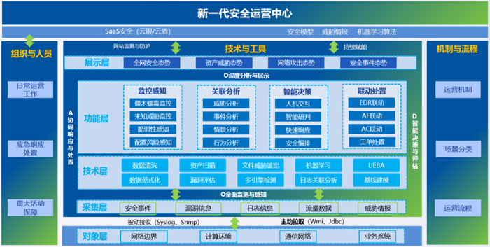 安全运营中心整体架构包括技术与工具、组织与人员及机制与流程。