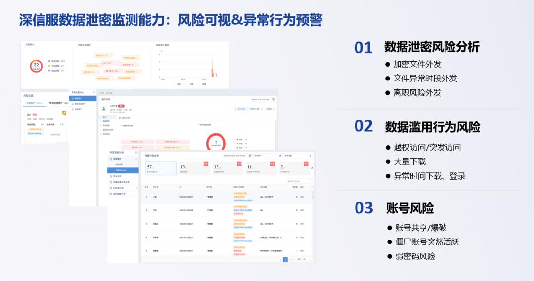 基于深信服 ITM 的泄密分析模块分析企业可能存在的敏感信息外发和泄密行为,通过 ITM 内置业务访问分析模块实现业务风险监测,同时结合深信服全网行为管理 AC 和 UEBA 技术实现数据泄密和数据滥用风险分析与预警。
