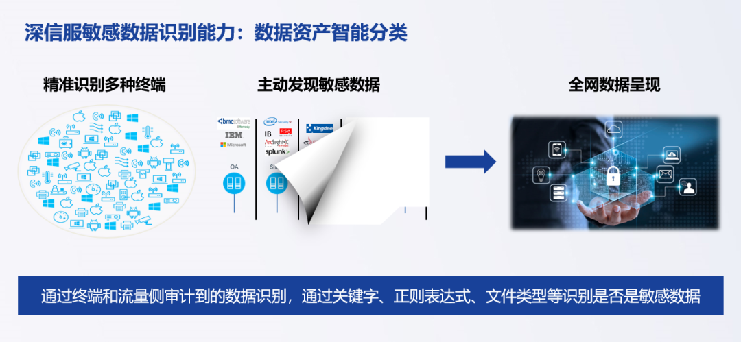 对全网资产(终端资产、业务资产和数据资产等)进行全面梳理,通过主动式、被动式及网络设备结合等全方位的检查方法,以及机器学习的方法对数据资产进行智能分类,形成数据资产地图,为进一步对敏感数据分析、泄密风险监测做好基础准备。