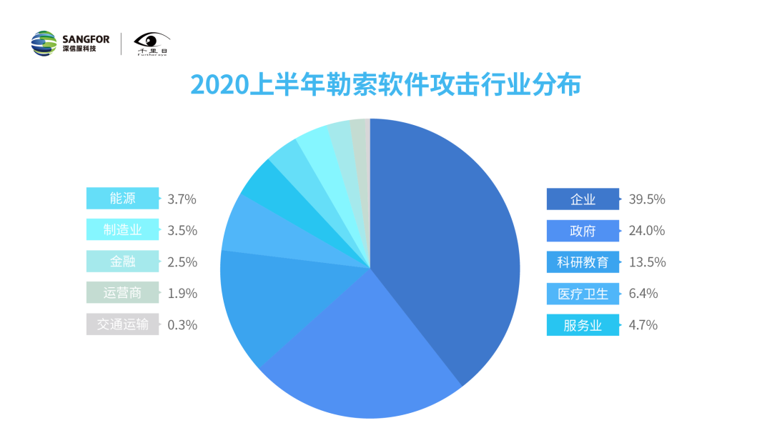 近日,深信服千里目安全实验室从勒索软件的整体攻击趋势、勒索模式、行业分布情况等方面进行分析,发布《2020上半年勒索软件洞察报告》(以下简称“报告”)。《报告》显示,2020上半年针对政府、企业、教育和医疗卫生行业的攻击持续增多,并出现勒索赎金高涨、商业运作规模化、专职化的特点。