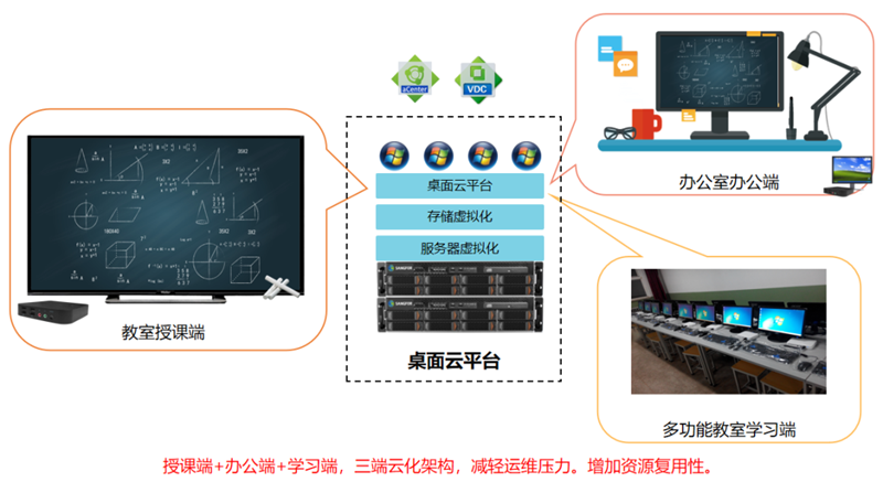 目前,深信服一站式桌面云建设方案已广泛用于“班班通”多媒体教学、学生实验机房、电子阅览室等场景,全栈式赋能教育现代化,让教育的信息化活起来!