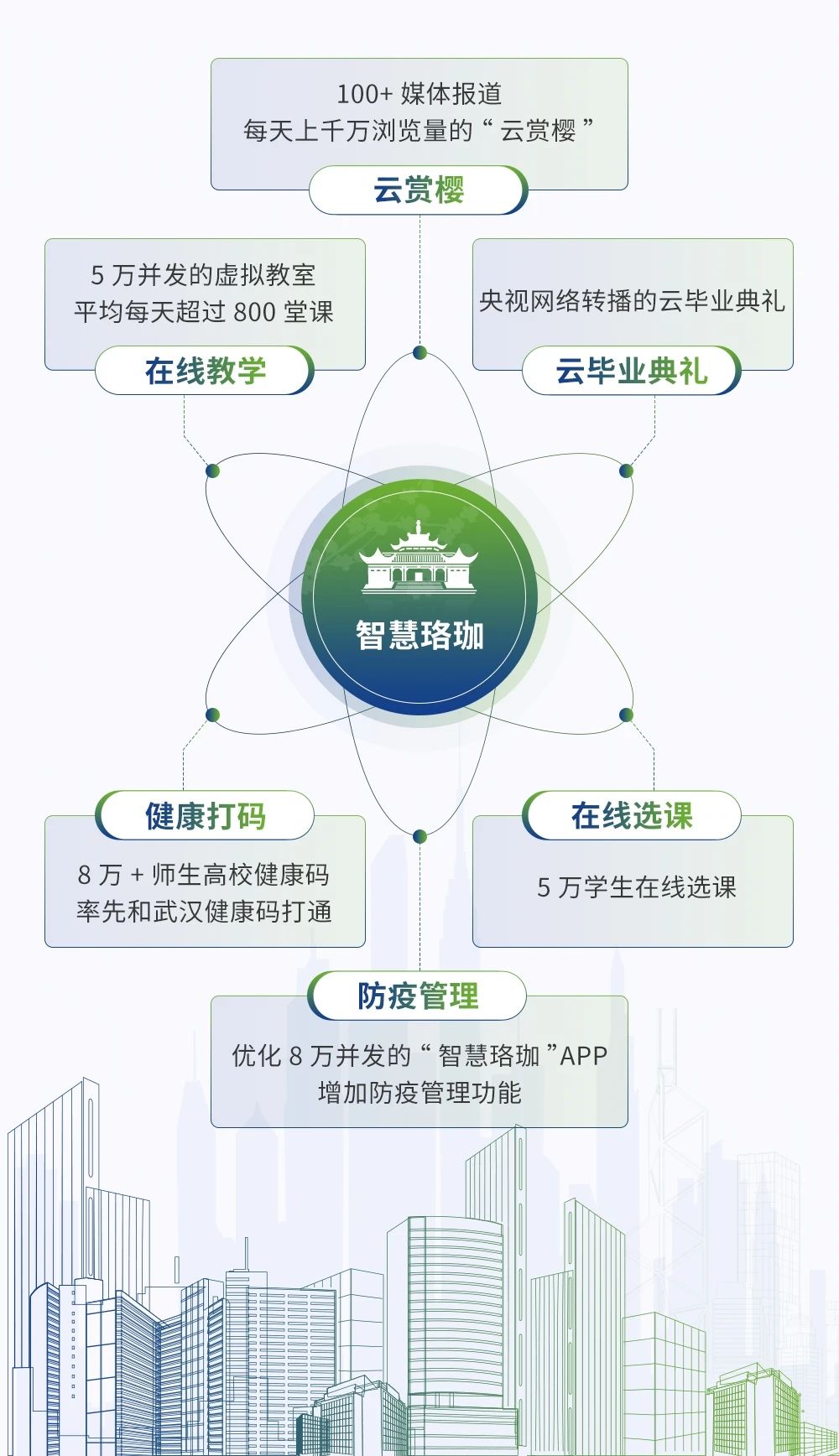 当人们还在为樱花带来的“美”和“谜”惊叹之际,武汉大学因完成了5万学生的在线选课、在线教学,率先将8万+师生高校健康码与武汉健康码打通,在8万+师生共同使用的“智慧珞珈”APP中增加防疫管理功能等“大事”,一举拿下2020年IDC疫情防控特别奖。无论是“云赏樱”的实现,还是疫情防控的系列给力大事,背后皆以武汉大学的“云”为基础。