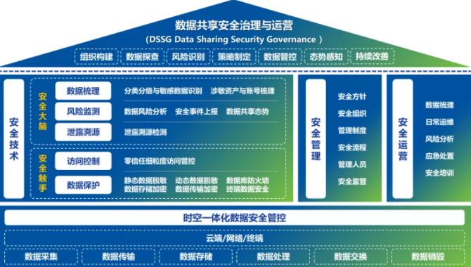 基于国内外数据安全合规要求、先进框架的研究以及大量行业实践,深信服提出以数据为中心,围绕数据生命周期,涵盖云端、网络、终端,打造时空一体化的主动防御体系,通过组织构建、数据探查、风险识别、策略制定、数据管控、态势感知、持续改善七个环节,实现数据共享安全治理与运营的闭环,最终实现政务信息共享过程全要素全流程的可视、可管,保障政务数据在政务信息共享过程中的安全使用。