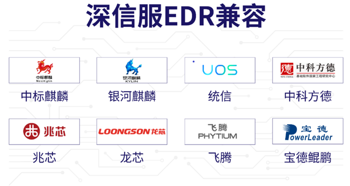 深信服终端检测响应平台EDR(简称“EDR”)目前已完成中标麒麟、银河麒麟、统信和中科方德操作系统,兆芯、龙芯、飞腾和宝德鲲鹏CPU的兼容认证(排名不分先后)!实现与国内八大国内主流操作系统、CPU兼容,为广大的用户提供企业级可靠的终端安全防御,助力构建安全的信息技术体系。