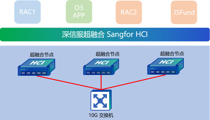 超融合架构使用了3台深信服超融合虚拟机组建虚拟化资源集群,以10G交换机作为虚拟分布式存储网连接设备。硬件之上部署超融合软件,虚拟出本次测试所需要的虚拟机承载O32不同组件。