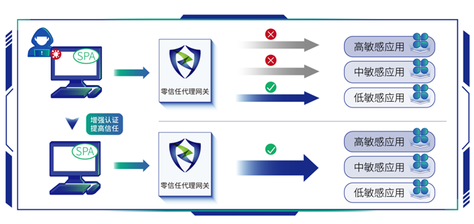 相反,如果终端一开始不符合高敏感应用的访问要求,可以通过增强认证等方式提高信任等级从而获得高敏感应用访问权限。