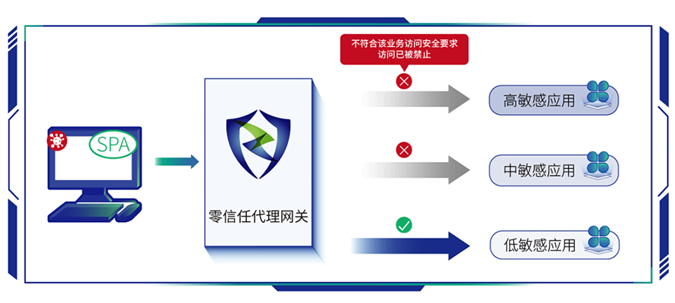 同时,基于业务应用的不同敏感度,零信任可为用户设置不同的业务准入策略,比如访问高敏感应用,需要限定指定终端和指定的网络环境;访问中敏感应用,只需限定指定终端;访问一般敏感应用,可以不限制终端和网络环境。