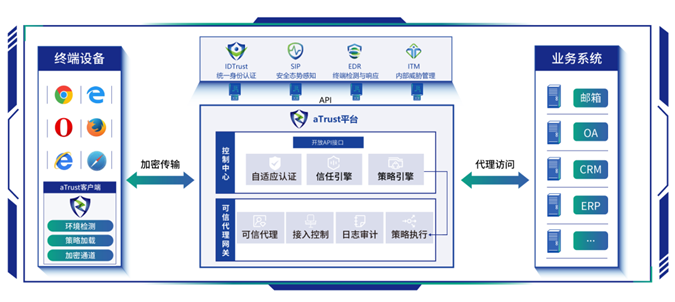 作为国内较早探索零信任应用的企业之一,深信服推出了零信任安全架构及相应的解决方案和产品,基于“以身份为中心,可信访问、智能权限、极简运维”的理念,通过新一代网络隐身、动态自适应认证、全周期终端环境检测、动态业务准入、动态访问控制、多源信任评估等核心能力,帮助用户实现流量身份化、权限智能化、访问控制动态化、运维管理极简化的新一代网络安全架构转型。