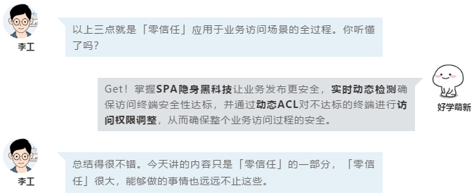 解决了业务的隐身问题,访问业务的终端成了新的“暴露面”,终端感染恶意程序、异常登录、不授信的网络环境等等都可能威胁到终端要访问的业务系统的安全。因此,需要对终端设备进行持续的信任评估。