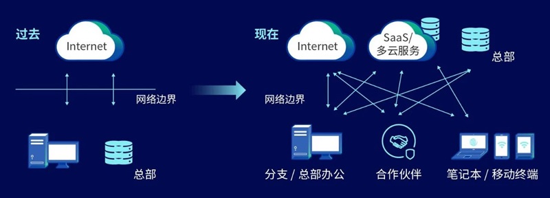 但随着企业数字化转型升级,业务互联网化、多云化和移动化,内外网边界模糊,业务访问已从单一网络模式转向交错复杂的形式,企业面临的安全风险面逐渐增多,传统网络安全架构已无法满足当前日益复杂的安全需求。
