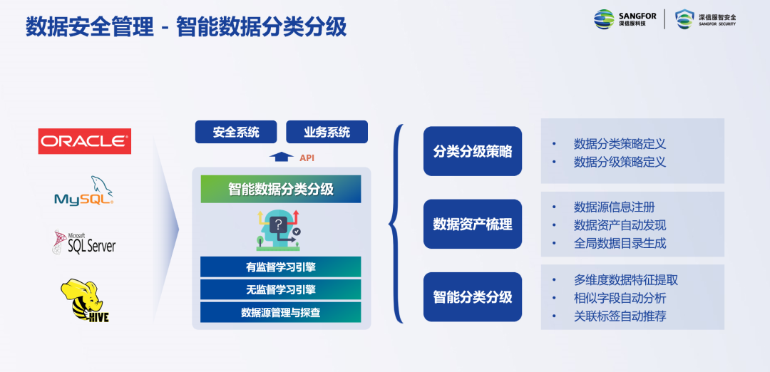 对组织的数据资产进行全局性的自动探查,生成全局的数据目录,是进行数据安全治理的基础和抓手。有了这个抓手,就可以通过机器学习,对数据字段进行多纬度特征的自动提取,并通过无监督机器学习实现相似字段的自动推荐,通过有监督学习实现关联标签的智能推荐,本质上是通过机器学习将数据分类分级的经验进行传递。目前,深信服还在研究基于深度学习和神经网络,对智能化做进一步的优化处理,通过这种方式,将大大提升分类分级的效率,让分类分级工作能够真正有效落地。