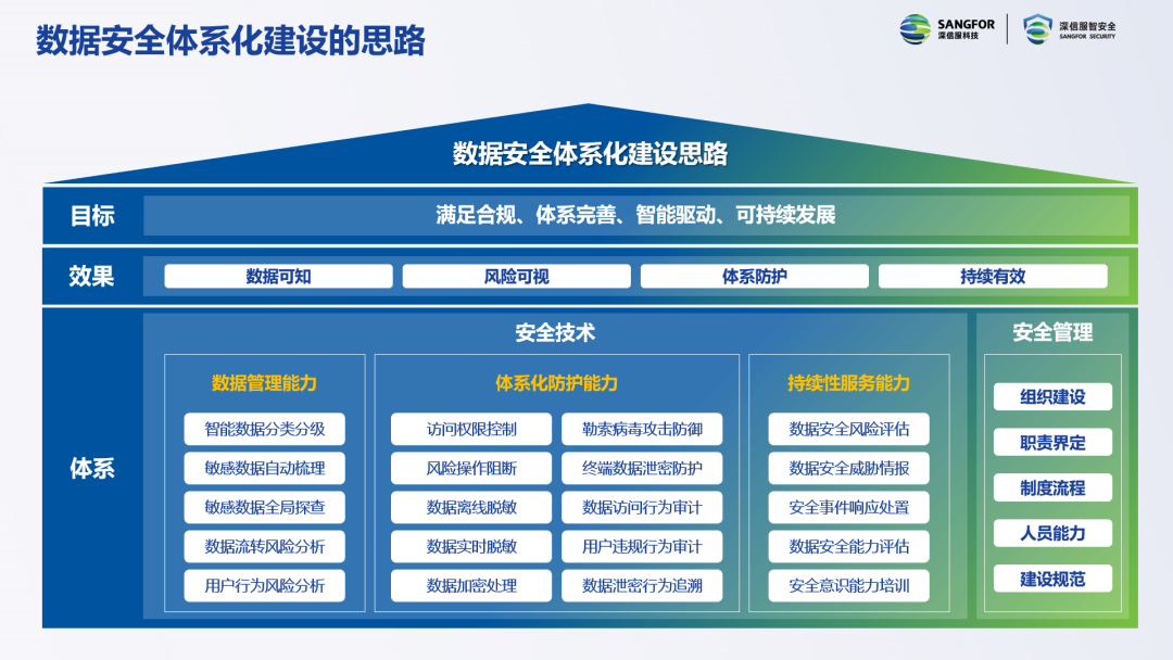 在本次会议中,深信服数据安全CTO张强发表了《依法治数共筑数据安全新防线》主题演讲,张强认为数据安全的建设需要循序渐进,通过技术+管理,构筑数据安全体系的底座,以达成“数据可知、风险可视、体系防护、持续有效”的效果,支撑“满足合规、体系完善、智能驱动、可持续发展”的目标。