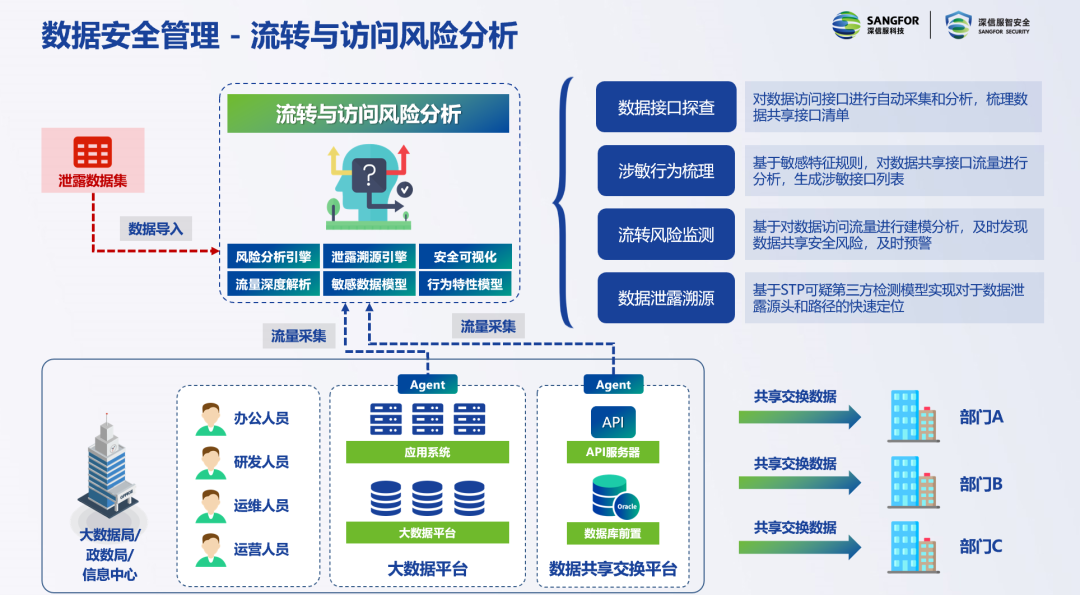 对风险的分析是数据安全管理的第二个关键点。数据到底怎么流转,被谁访问、通过什么方式进行访问?是否存在泄密和违规的风险,当出现问题的时候,是否能够追溯?这些问题都需要组织明晰。目前,深信服已经可以实现全方位的数据“监控”,通过对数据流量的监测和分析,绘制出数据访问和流转的态势;通过风险建模和UEBA等技术,分析出潜在的泄密和违规访问风险;当数据发生泄露之后,通过智能的AI算法对泄露数据所有的内容,在数据流转历史里面进行高效搜索,找到可疑者,实现泄密的溯源。